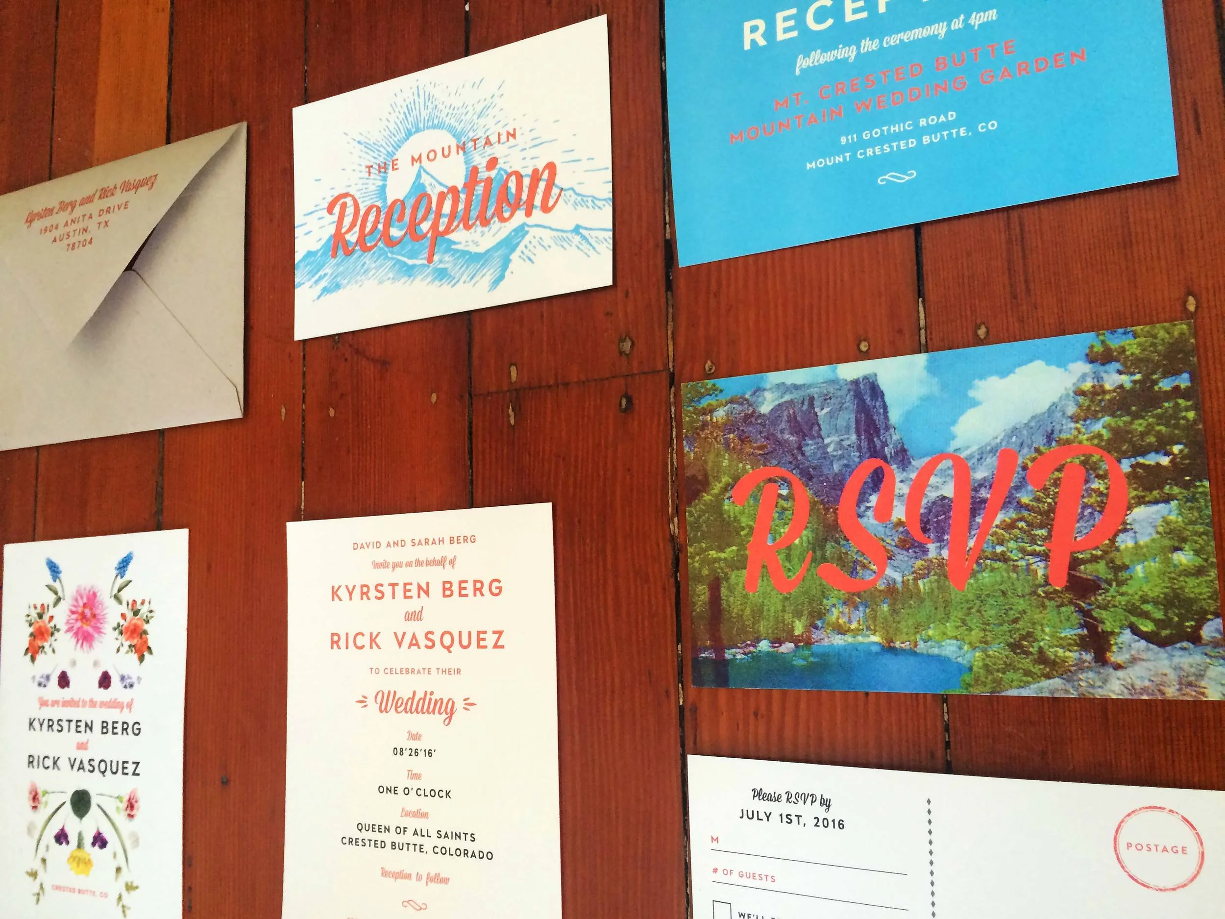 This was a labor of love, a wedding suite for my sister's Colorado wedding. A lot of personal details went into the design–incorporating vintage floral illustrations from their my sister's native Texas and Rick's native Mexico along with local fauna from Colorado where the wedding took place. Other pieces used elements reminiscent of vintage vacation postcards for this mountain destination wedding. The typography and etching elements were all custom letterpress for a lovely textured finished.